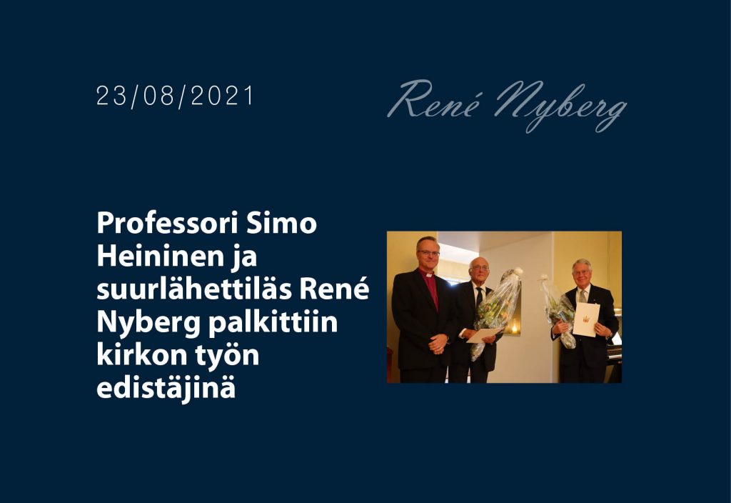 Professori Simo Heininen ja suurlähettiläs René Nyberg palkittiin kirkon työn edistäjinä August 25, 2021 Suomi, Text